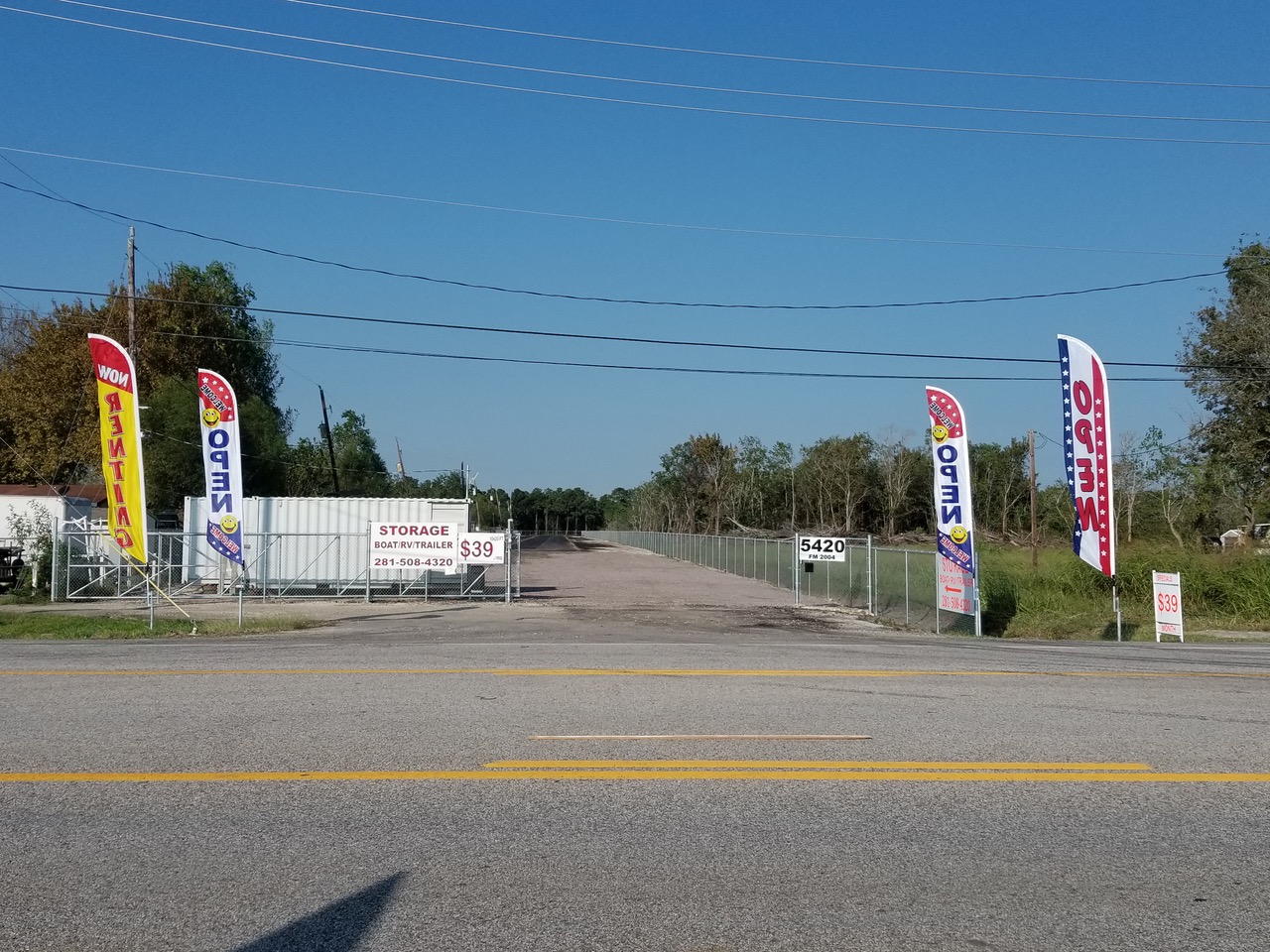 Located at 5420 FM 2004, Hitchcock Tx 77563 , less than 1 mile from the Gulf Greyhound Track, offers 24 hours access and video surveillance . Open parking for boats, RV , trailers and other vehicles. Rinse station on site for customers. Daily visual inspection by staff to all parked units. Easy access ! Owners will assist with trailer moving , relocation/delivery or any other request that yow might have. Parking spaces available for up to 35 FT long units.